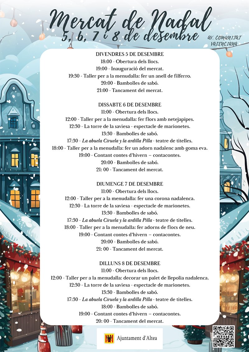 Música, esport, contacontes, mercat nadalenc, tallers, festes de cap d’any, cavalcades de Reis, visita del Pare Noel, cinema, espectacles familiars, Belén de la Casa de Cultura, campanyes comercials, sopar de cap d’any per a majors, entre altres, omplin l’agenda nadalenca d’Altea des de divendres que ve 5 de desembre, fins al 6 de gener. Activitats organitzades per l’ajuntament d’Altea que compten amb la implicació social i festera del municipi; com són les comissions de festes del Stm. Crist del Sagrari i de Santa Anna, Federació de Moros i Cristians Sant Blai, o les ONG presents en el municipi. A totes elles, els edils de Festes, Joaquim Devesa; de Comerç, Jose Maria Borja; de Cultura, Pepa V. Pérez; de Normalització Lingüística, Xelo González; d’Esports, Sara soler i de Benestar Social, Anna Lanuza, agraïxen el seu treball.