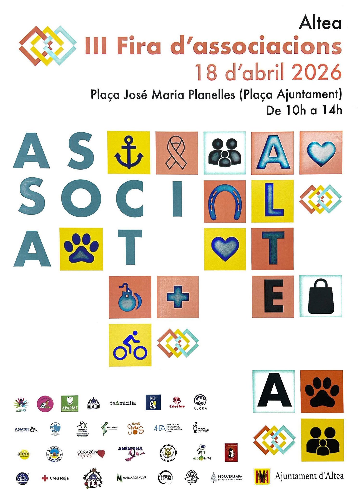Organizador Ayuntamiento de Altea Localización Plaza del Ayuntamiento Plaça José María Planelles, 1, 03590 Altea, Alicante Categoría Conferencias / cursos Otros Portada Fecha Abr 18 2026 Hora 10:00 - 14:00 Coste Acceso libre III Feria de asociaciones de Altea – 2026 18-abr | 10-14 H | Pl. Ayuntamiento III Feria de asociaciones de Altea Compartir este evento + Añadir Google Calendar Exportación + iCal 00 días 00 horas 00 minutos 00 segundos
